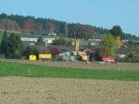aufwändige Baustelle (von links nach rechts): Treibstoffvorrat, Hauptkompressor für Bohrschlammförderung, Mulde für Bohrschlamm, Bohrgerät mit Kran und zweite Mulde für Überlauf (mit der Maus darüber fahren)